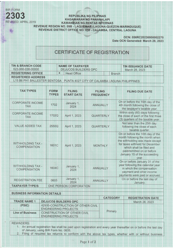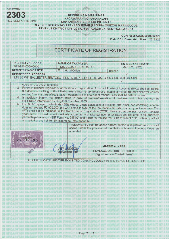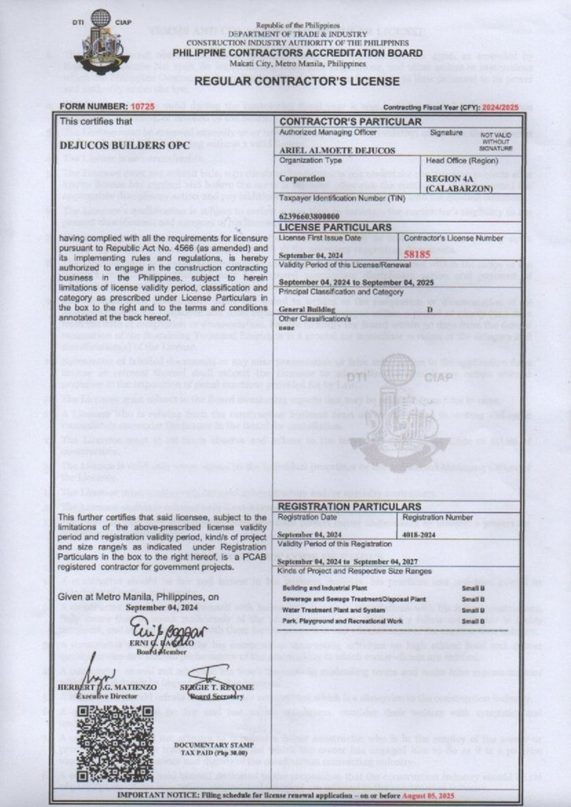 DeJucos Builder OPC is a registered and legitimate construction company in the Philippines, backed by a team of skilled and experienced professionals. Our competent engineers, architects, and builders work with precision and integrity to deliver every project with quality, safety, and excellence in mind.